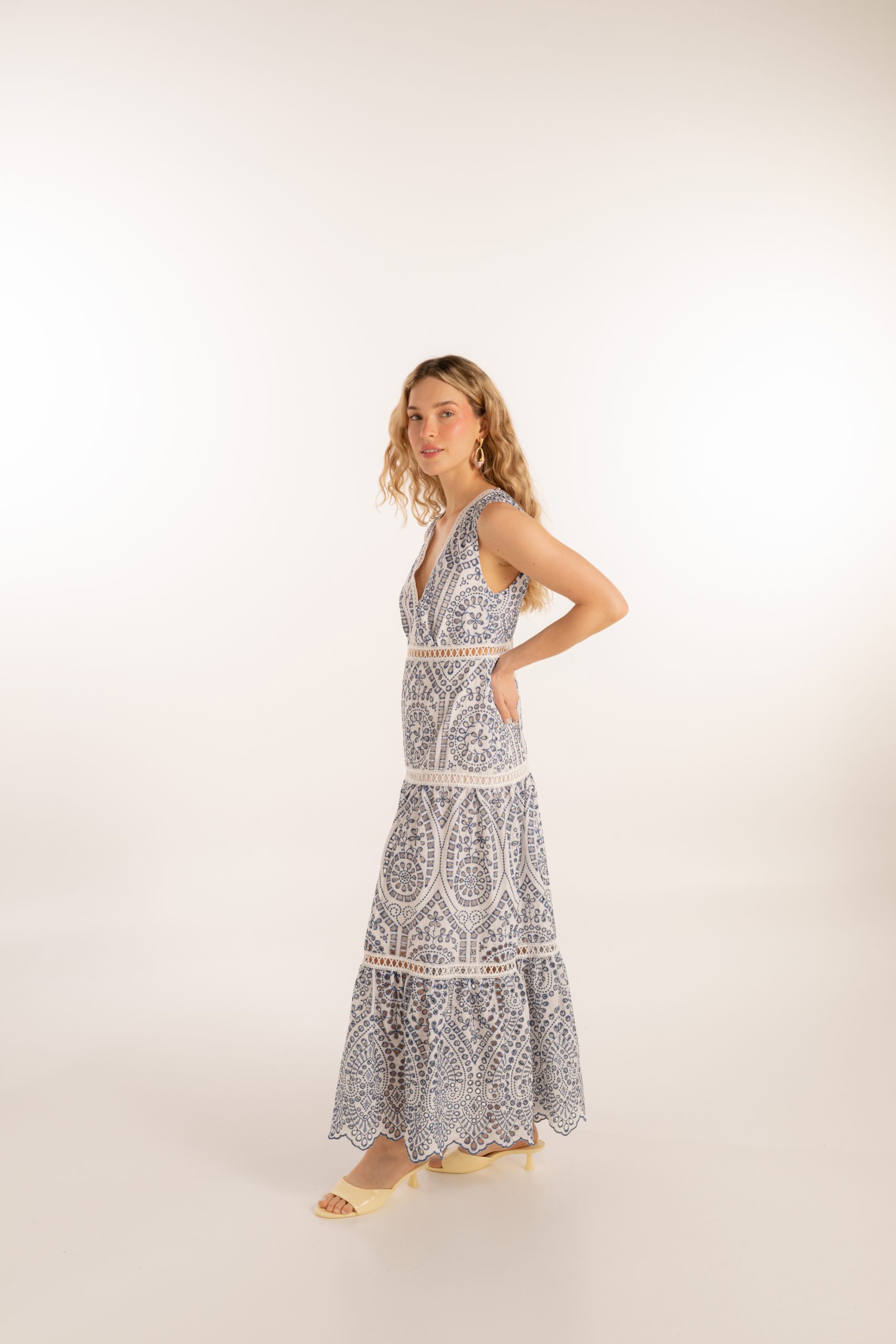 Vestido largo en ojalillo – romanticismo que se mueve contigo Este vestido largo en ojalillo es una oda a la feminidad. Su escote en V realza el cuello y estiliza la silueta, mientras que la falda fluida con tres golas separadas por delicados encajes aporta movimiento y textura. La espalda con escote sutil añade un toque de sensualidad discreta, perfecto para ocasiones especiales o días en los que quieres sentirte única. Confeccionado en algodón bordado, es fresco, ligero y lleno de detalles que enamoran.